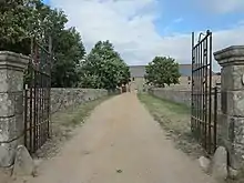 Les communs aveugles vers l'extérieur comportent une charetterie à trois arches délimitées par des colonnes en granit légèrement rosé taillées au carré. Au-dessus, deux des trois lucarnes sont surmontées par des frontons en arrondis dans lesquels sont sculptées de larges coquilles Saint-Jacques.