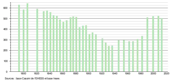 L'évolution du nombre d'habitants est connue à travers les recensements de la population effectués dans la commune depuis 1793. À partir du , les populations légales des communes sont publiées annuellement dans le cadre d'un recensement qui repose désormais sur une collecte d'information annuelle, concernant successivement tous les territoires communaux au cours d'une période de cinq ans. Pour les communes de moins de 10 000 habitants, une enquête de recensement portant sur toute la population est réalisée tous les cinq ans, les populations légales des années intermédiaires étant quant à elles estimées par interpolation ou extrapolation[18]. Pour la commune, le premier recensement exhaustif entrant dans le cadre du nouveau dispositif a été réalisé en 2007[19],[Note 2].