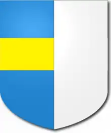 Les armes: parti d'azur et d'argent, avec une fasce d'argent sur l'azur