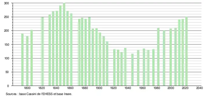 L'évolution du nombre d'habitants est connue à travers les recensements de la population effectués dans la commune depuis 1793. Pour les communes de moins de 10 000 habitants, une enquête de recensement portant sur toute la population est réalisée tous les cinq ans, les populations légales des années intermédiaires étant quant à elles estimées par interpolation ou extrapolation[28]. Pour la commune, le premier recensement exhaustif entrant dans le cadre du nouveau dispositif a été réalisé en 2006[29].