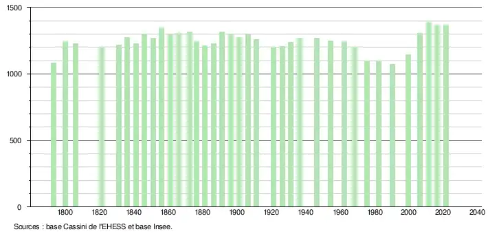 L'évolution du nombre d'habitants est connue à travers les recensements de la population effectués dans la commune depuis 1793. Pour les communes de moins de 10 000 habitants, une enquête de recensement portant sur toute la population est réalisée tous les cinq ans, les populations légales des années intermédiaires étant quant à elles estimées par interpolation ou extrapolation[29]. Pour la commune, le premier recensement exhaustif entrant dans le cadre du nouveau dispositif a été réalisé en 2006[30].