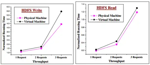 L’évaluation des performances du HDFS se fait dans un cluster physique (PH-HDFS) et dans un cluster virtuel (VM-HDFS lors d’écriture et de lecture de données afin de montrer les différences de performances entre un cluster physique et un cluster virtuel.