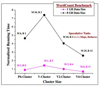 Comme le montre cette figure, le benchmark « comptage de mots » avec le Ph-Cluster est plus rapide que le V-Cluster. Lorsque les données font 1 Gb, la différence est faible. Mais lorsque les données sont beaucoup plus importantes (ici 8 Gb), on observe un écart important. Cela est causé par l’augmentation des tâches spéculatives ce qui cause une utilisation inefficace des ressources. En revanche, les clusters V2 et V4 sont beaucoup plus performants que le Ph-Cluster car il y a beaucoup plus de calculs par cycle.