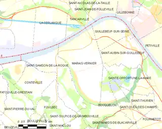 Son territoire est réparti entre sept communes : Marais-Vernier, Bouquelon, Saint-Ouen-des-Champs, Saint-Thurien, Sainte-Opportune-la-Mare, Saint-Aubin-sur-Quillebeuf et Quillebeuf-sur-Seine[3]. La commune du Marais-Vernier est la seule à être totalement située dans la cuvette formée par l'ancien méandre correspondant à l'ancien marais. De plus, contrairement à elle, les autres communes sont soit tournées vers la Seine (Saint-Aubin-sur-Quillebeuf et Quillebeuf-sur-Seine), soit tournées vers le plateau du Roumois (Bouquelon, Saint-Ouen-des-Champs, Saint-Thurien et Sainte-Opportune-la-Mare). Ces quatre dernières communes ont d'ailleurs toutes leur centre qui est situé sur le plateau du Roumois et non dans le marais[4].