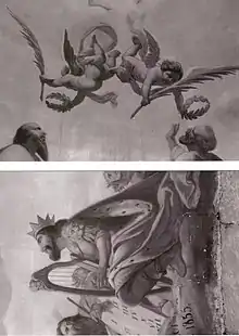 Les peintures murales sont datées d' et signées par le peintre Joseph-Constant Ménissier. Elles ont été exécutées à l'huile sur plâtre, il ne s'agit donc pas d'une technique à fresque. Ces peintures ont fait l'objet dune restauration en février et par Anne Féton[27] et Claire Bigand[28]. Un travail de conservation a été effectué par le biais d'injection de coulis, de consolidation et refixage de la couche picturale, et dans un second temps un travail de restauration enduit et retouche a permis de protéger et de redonner une meilleure lisibilité aux peintures.