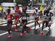Tête de la course masculine avec Birhanu Legese (à droite) derrière Bedan Karoki et un lièvre.