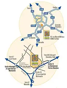 À proximité de Lyon et au cœur d’un nœud autoroutier, le nouveau marché de gros est situé dans la zone agroalimentaire de Corbas sur un site de 12 hectares. Les bâtiments sont répartis de manière suivante :