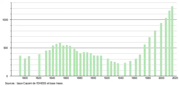 L'évolution du nombre d'habitants est connue à travers les recensements de la population effectués dans la commune depuis 1793. Pour les communes de moins de 10 000 habitants, une enquête de recensement portant sur toute la population est réalisée tous les cinq ans, les populations légales des années intermédiaires étant quant à elles estimées par interpolation ou extrapolation[4]. Pour la commune, le premier recensement exhaustif entrant dans le cadre du nouveau dispositif a été réalisé en 2006[5].