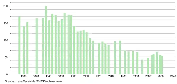 L'évolution du nombre d'habitants est connue à travers les recensements de la population effectués dans la commune depuis 1793. Pour les communes de moins de 10 000 habitants, une enquête de recensement portant sur toute la population est réalisée tous les cinq ans, les populations légales des années intermédiaires étant quant à elles estimées par interpolation ou extrapolation[13]. Pour la commune, le premier recensement exhaustif entrant dans le cadre du nouveau dispositif a été réalisé en 2008[14].