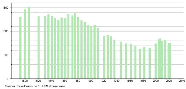 L'évolution du nombre d'habitants est connue à travers les recensements de la population effectués dans la commune depuis 1793. Pour les communes de moins de 10 000 habitants, une enquête de recensement portant sur toute la population est réalisée tous les cinq ans, les populations légales des années intermédiaires étant quant à elles estimées par interpolation ou extrapolation[22]. Pour la commune, le premier recensement exhaustif entrant dans le cadre du nouveau dispositif a été réalisé en 2004[23].