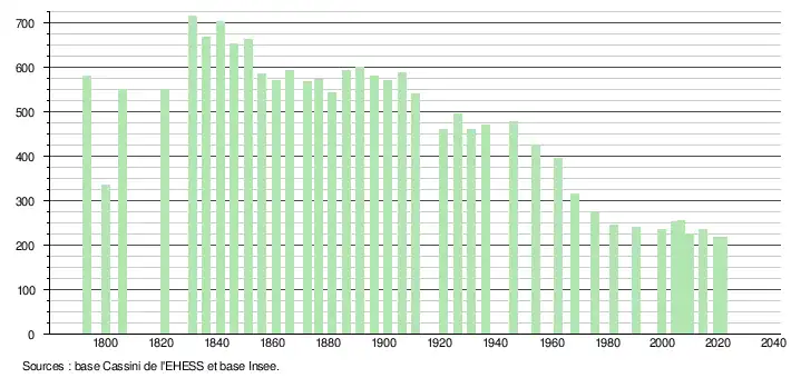 L'évolution du nombre d'habitants est connue à travers les recensements de la population effectués dans la commune depuis 1793. Pour les communes de moins de 10 000 habitants, une enquête de recensement portant sur toute la population est réalisée tous les cinq ans, les populations légales des années intermédiaires étant quant à elles estimées par interpolation ou extrapolation[24]. Pour la commune, le premier recensement exhaustif entrant dans le cadre du nouveau dispositif a été réalisé en 2004[25].