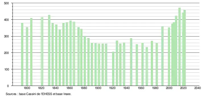 L'évolution du nombre d'habitants est connue à travers les recensements de la population effectués dans la commune depuis 1793. Pour les communes de moins de 10 000 habitants, une enquête de recensement portant sur toute la population est réalisée tous les cinq ans, les populations légales des années intermédiaires étant quant à elles estimées par interpolation ou extrapolation[42]. Pour la commune, le premier recensement exhaustif entrant dans le cadre du nouveau dispositif a été réalisé en 2004[43].
