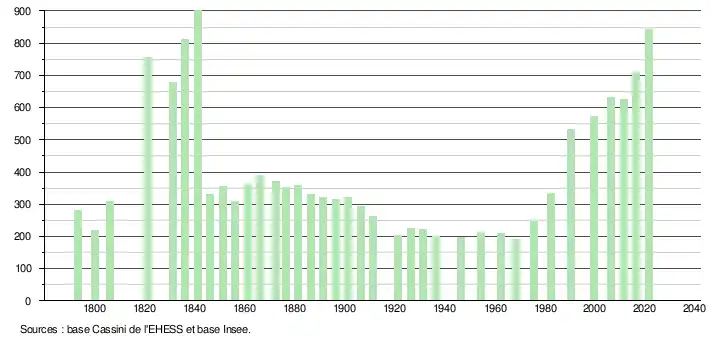 L'évolution du nombre d'habitants est connue à travers les recensements de la population effectués dans la commune depuis 1793. Pour les communes de moins de 10 000 habitants, une enquête de recensement portant sur toute la population est réalisée tous les cinq ans, les populations légales des années intermédiaires étant quant à elles estimées par interpolation ou extrapolation[16]. Pour la commune, le premier recensement exhaustif entrant dans le cadre du nouveau dispositif a été réalisé en 2006[17].