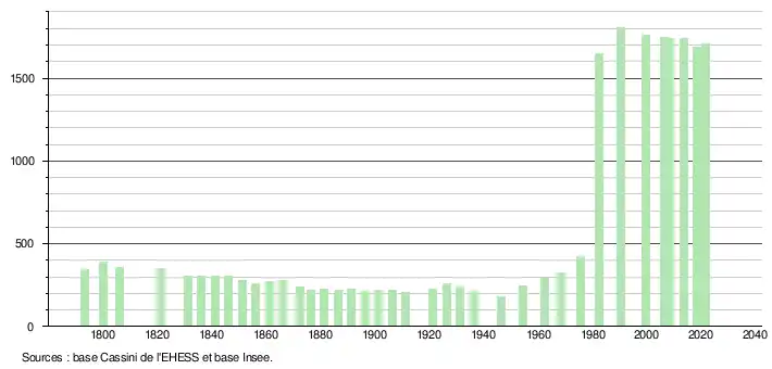 L'évolution du nombre d'habitants est connue à travers les recensements de la population effectués dans la commune depuis 1793. Pour les communes de moins de 10 000 habitants, une enquête de recensement portant sur toute la population est réalisée tous les cinq ans, les populations légales des années intermédiaires étant quant à elles estimées par interpolation ou extrapolation[17]. Pour la commune, le premier recensement exhaustif entrant dans le cadre du nouveau dispositif a été réalisé en 2008[18].