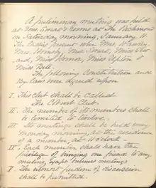 "au début, personne ne pensait à faire du club un centre littéraire, mais voilà juste la différence entre un club d'hommes ou de femme; pour le premier le club est un lieu de loisirs et pour la dernière, il doit être un lieu de culture pour soi dans une direction ou une autre."