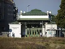 L'entrée est surmontée d'un auvent en forte saillie peint en couleur vert pomme, une caractéristique commune à toutes les stations de la Stadtbahn réalisées par Otto Wagner[13]. Cet auvent est porté par deux hautes colonnettes en fer forgé supportant une frise de couronnes de laurier abritée sous l'auvent. Au-dessus de l'auvent rectangulaire non orné, on aperçoit le corps central de la station, de forme carrée, orné sur chaque face d'un entablement en maçonnerie composé d'une architrave ornée de cartouches à crossettes, alternant avec des triglyphes. Ce corps central est marqué à chaque angle d'une cheminée.