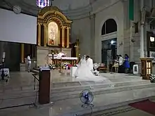 Le mariage est un sacrement que se donnent les époux, mais il a toujours lieu dans une église ou, à défaut, une chapelle familiale[17]. Il est réalisé sous l'autorité de l'évêque du lieu dont dépend le prêtre officiant.