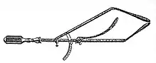 - Intropelvimètre : « L'une des branches de ce compas est introduite dans le vagin et vient prendre appui sur la face postérieure du pubis ; l'autre branche pénètre dans le bassin, en glissant dans le rectum, jusqu'à ce qu'elle arrive au contact du promontoire[Note 6] ». Mme Boivin, dans le mémoire où elle décrit son intropelvimètre, ajoute qu'il pourrait être employé comme céphalomètre pour mesurer la tête pendant l'accouchement. L'invention est décrite dans un texte, Recherches sur une des causes les plus fréquentes et la moins connue de l’avortement …