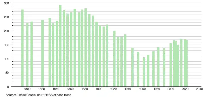 L'évolution du nombre d'habitants est connue à travers les recensements de la population effectués dans la commune depuis 1793. Pour les communes de moins de 10 000 habitants, une enquête de recensement portant sur toute la population est réalisée tous les cinq ans, les populations légales des années intermédiaires étant quant à elles estimées par interpolation ou extrapolation[16]. Pour la commune, le premier recensement exhaustif entrant dans le cadre du nouveau dispositif a été réalisé en 2004[17].