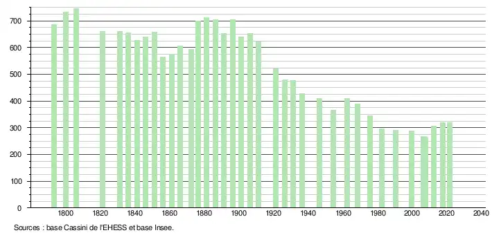 L'évolution du nombre d'habitants est connue à travers les recensements de la population effectués dans la commune depuis 1793. Pour les communes de moins de 10 000 habitants, une enquête de recensement portant sur toute la population est réalisée tous les cinq ans, les populations légales des années intermédiaires étant quant à elles estimées par interpolation ou extrapolation[15]. Pour la commune, le premier recensement exhaustif entrant dans le cadre du nouveau dispositif a été réalisé en 2007[16].