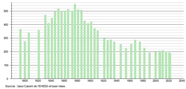L'évolution du nombre d'habitants est connue à travers les recensements de la population effectués dans la commune depuis 1793. Pour les communes de moins de 10 000 habitants, une enquête de recensement portant sur toute la population est réalisée tous les cinq ans, les populations légales des années intermédiaires étant quant à elles estimées par interpolation ou extrapolation[14]. Pour la commune, le premier recensement exhaustif entrant dans le cadre du nouveau dispositif a été réalisé en 2005[15].