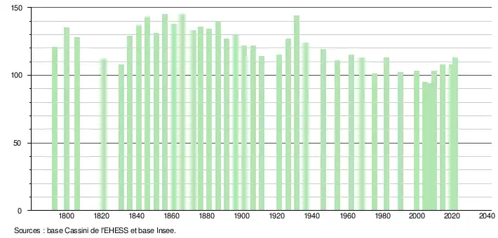 L'évolution du nombre d'habitants est connue à travers les recensements de la population effectués dans la commune depuis 1793. Pour les communes de moins de 10 000 habitants, une enquête de recensement portant sur toute la population est réalisée tous les cinq ans, les populations légales des années intermédiaires étant quant à elles estimées par interpolation ou extrapolation[16]. Pour la commune, le premier recensement exhaustif entrant dans le cadre du nouveau dispositif a été réalisé en 2004[17].