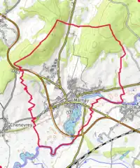 L'occupation des sols de la commune, telle qu'elle ressort de la base de données européenne d’occupation biophysique des sols Corine Land Cover (CLC), est marquée par l'importance des territoires agricoles (57,8 % en 2018), néanmoins en diminution par rapport à 1990 (63,4 %). La répartition détaillée en 2018 est la suivante : forêts (22,2 %), terres arables (21,4 %), zones agricoles hétérogènes (18,8 %), prairies (17,6 %), zones urbanisées (12,2 %), zones industrielles ou commerciales et réseaux de communication (4,2 %), eaux continentales[Note 4] (3,7 %)[13]. L'évolution de l’occupation des sols de la commune et de ses infrastructures peut être observée sur les différentes représentations cartographiques du territoire : la carte de Cassini (XVIIIe siècle), la carte d'état-major (1820-1866) et les cartes ou photos aériennes de l'IGN pour la période actuelle (1950 à aujourd'hui)[Carte 1].