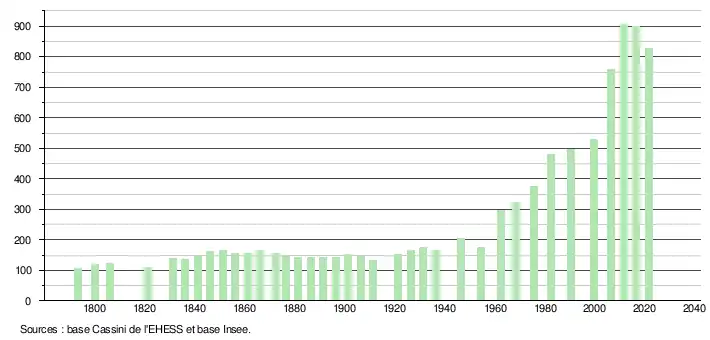 L'évolution du nombre d'habitants est connue à travers les recensements de la population effectués dans la commune depuis 1793. Pour les communes de moins de 10 000 habitants, une enquête de recensement portant sur toute la population est réalisée tous les cinq ans, les populations légales des années intermédiaires étant quant à elles estimées par interpolation ou extrapolation[24]. Pour la commune, le premier recensement exhaustif entrant dans le cadre du nouveau dispositif a été réalisé en 2006[25].