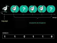 Notation : A chacune des occasions de capture, on regarde si l′individu était présent (codé "1" ) ou absent (codé "0"). Le code "0" peut signifier deux choses : soit la non-capture de l'individu, soit sa mort.