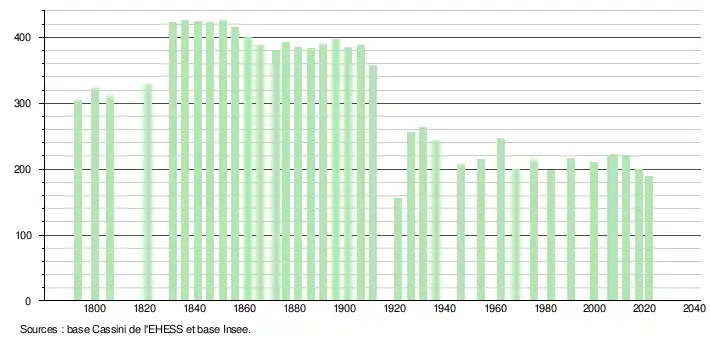 L'évolution du nombre d'habitants est connue à travers les recensements de la population effectués dans la commune depuis 1793. Pour les communes de moins de 10 000 habitants, une enquête de recensement portant sur toute la population est réalisée tous les cinq ans, les populations légales des années intermédiaires étant quant à elles estimées par interpolation ou extrapolation[25]. Pour la commune, le premier recensement exhaustif entrant dans le cadre du nouveau dispositif a été réalisé en 2007[26].