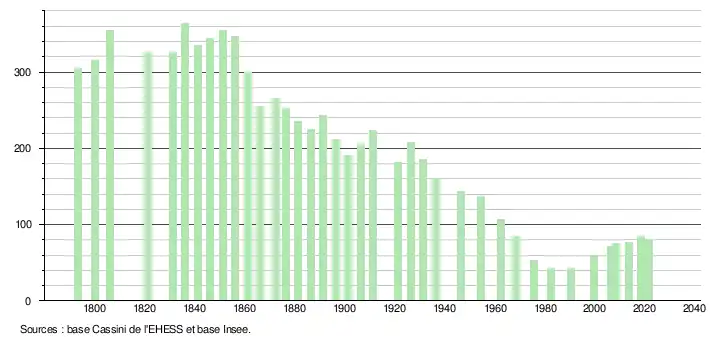 L'évolution du nombre d'habitants est connue à travers les recensements de la population effectués dans la commune depuis 1793. Pour les communes de moins de 10 000 habitants, une enquête de recensement portant sur toute la population est réalisée tous les cinq ans, les populations légales des années intermédiaires étant quant à elles estimées par interpolation ou extrapolation[25]. Pour la commune, le premier recensement exhaustif entrant dans le cadre du nouveau dispositif a été réalisé en 2008[26].