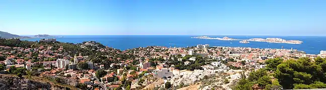 La commune de Marseille a une façade maritime de 57 kilomètres dont 24 kilomètres de calanques et deux petits archipels d'îles et îlots (Riou et Frioul, le premier étant inhabité).
