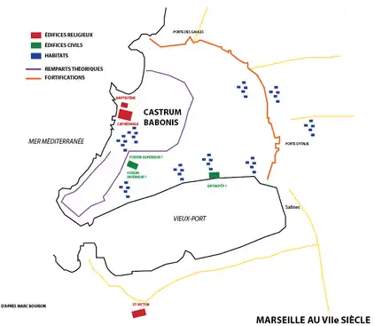 Nous savons que Marseille, à la fin du VIIe siècle, est particulièrement enfermée dans une enceinte réduite, le castrum Babonis de l'évêque, fortification qui a sans doute beaucoup servi lors des invasions successives du IXe siècle. Face à lui a été érigé un autre castrum (château), occupé par le pouvoir civil. Entre ces deux bâtiments se trouve un espace formé de l'ancienne zone du forum, qui va se dépeupler au IXe siècle à cause des ravages qu'ont entraînés les invasions[19].