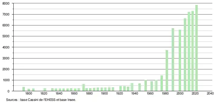 L'évolution du nombre d'habitants est connue à travers les recensements de la population effectués dans la commune depuis 1793. Pour les communes de moins de 10 000 habitants, une enquête de recensement portant sur toute la population est réalisée tous les cinq ans, les populations légales des années intermédiaires étant quant à elles estimées par interpolation ou extrapolation[33]. Pour la commune, le premier recensement exhaustif entrant dans le cadre du nouveau dispositif a été réalisé en 2006[34].