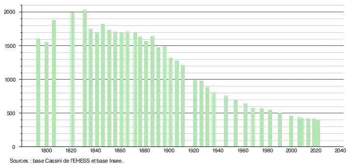 L'évolution du nombre d'habitants est connue à travers les recensements de la population effectués dans la commune depuis 1793. Pour les communes de moins de 10 000 habitants, une enquête de recensement portant sur toute la population est réalisée tous les cinq ans, les populations légales des années intermédiaires étant quant à elles estimées par interpolation ou extrapolation[16]. Pour la commune, le premier recensement exhaustif entrant dans le cadre du nouveau dispositif a été réalisé en 2008[17].