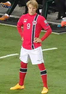 Le , il est sélectionné en équipe nationale afin de jouer un match amical face aux Émirats arabes unis à Stavanger le [44]. En jouant la rencontre complète, il devient le plus jeune joueur à avoir évolué sous le maillot norvégien, à l'âge de 15 ans et 253 jours[45],[46],[47]. Le record précédent était tenu depuis 1910 par Tormod Kjellsen, qui avait 15 ans et 351 jours lors de ses débuts[48].