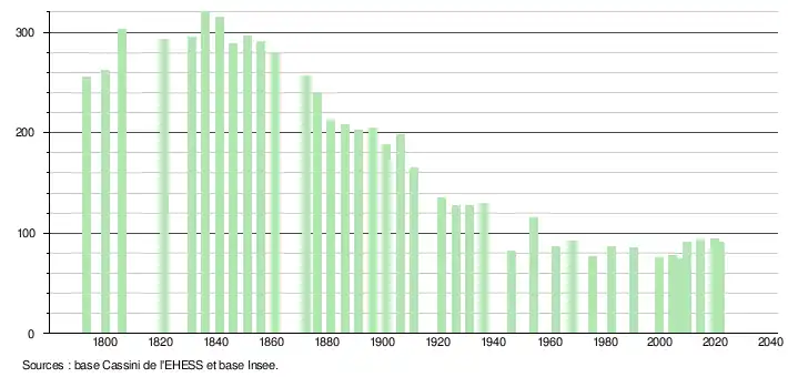 L'évolution du nombre d'habitants est connue à travers les recensements de la population effectués dans la commune depuis 1793. Pour les communes de moins de 10 000 habitants, une enquête de recensement portant sur toute la population est réalisée tous les cinq ans, les populations légales des années intermédiaires étant quant à elles estimées par interpolation ou extrapolation[30]. Pour la commune, le premier recensement exhaustif entrant dans le cadre du nouveau dispositif a été réalisé en 2004[31].