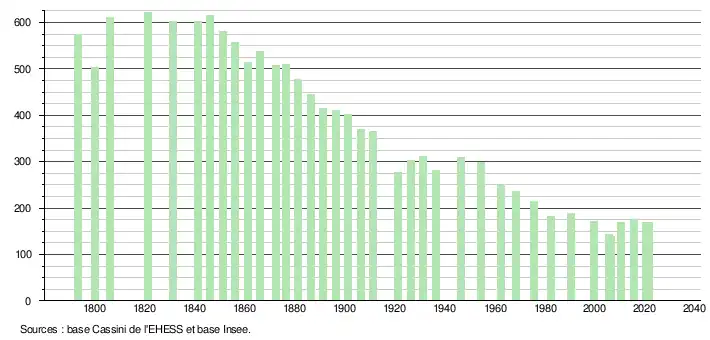 L'évolution du nombre d'habitants est connue à travers les recensements de la population effectués dans la commune depuis 1793. Pour les communes de moins de 10 000 habitants, une enquête de recensement portant sur toute la population est réalisée tous les cinq ans, les populations légales des années intermédiaires étant quant à elles estimées par interpolation ou extrapolation[24]. Pour la commune, le premier recensement exhaustif entrant dans le cadre du nouveau dispositif a été réalisé en 2005[25].