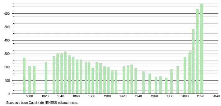 L'évolution du nombre d'habitants est connue à travers les recensements de la population effectués dans la commune depuis 1793. Pour les communes de moins de 10 000 habitants, une enquête de recensement portant sur toute la population est réalisée tous les cinq ans, les populations légales des années intermédiaires étant quant à elles estimées par interpolation ou extrapolation[36]. Pour la commune, le premier recensement exhaustif entrant dans le cadre du nouveau dispositif a été réalisé en 2005[37].