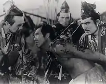 Masayuki Mori (au centre) dans Les Contes de la lune vague après la pluie (1953).