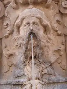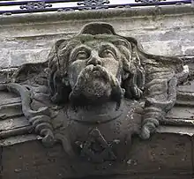 - Le mascaron : « est une tête chargée ou ridicule, faite à fantaisie, comme une grimace, qu'on met aux portes, grottes, fontaines… Ce mot vient de l'italien Mascharone, fait de l'arabe Mascara, bouffonnerie ».