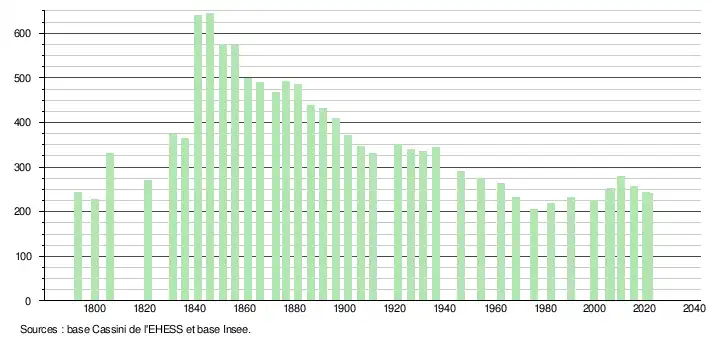 L'évolution du nombre d'habitants est connue à travers les recensements de la population effectués dans la commune depuis 1793. Pour les communes de moins de 10 000 habitants, une enquête de recensement portant sur toute la population est réalisée tous les cinq ans, les populations légales des années intermédiaires étant quant à elles estimées par interpolation ou extrapolation[44]. Pour la commune, le premier recensement exhaustif entrant dans le cadre du nouveau dispositif a été réalisé en 2005[45].