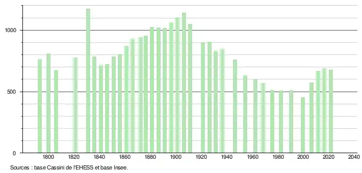 L'évolution du nombre d'habitants est connue à travers les recensements de la population effectués dans la commune depuis 1793. Pour les communes de moins de 10 000 habitants, une enquête de recensement portant sur toute la population est réalisée tous les cinq ans, les populations légales des années intermédiaires étant quant à elles estimées par interpolation ou extrapolation[27]. Pour la commune, le premier recensement exhaustif entrant dans le cadre du nouveau dispositif a été réalisé en 2006[28].