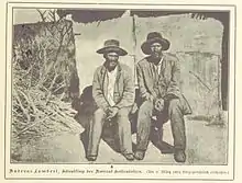 - Légende originale indexée par Archives fédérales allemandes : « Deutsch-Südwest-Afrika.- Kriegsgefangene Nama (Herero; kolorierte Postkarte) ».