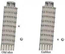 Pour la pensée scolastique, gouvernée par les enseignements d'Aristote, le poids est une qualité intrinsèque de la matière, laquelle est par nature attirée vers le bas parce que c'est son lieu de repos ; mais c'est une propriété des seuls corps lourds susceptibles de chuter[3] : l'air n'a pas de poids et reste à son emplacement, de même que les nuages. La loi empirique du mouvement est que tout corps tend vers son lieu de repos naturel, soit en tombant quand il est en l'air, soit en s'arrêtant progressivement quand il roule au sol : le mouvement résulte d'un déséquilibre, et le rétablissement de cet équilibre entraîne l'absence de mouvement. De plus, l'expérience courante montre que les objets lourds comme une enclume tombent rapidement, tandis que les objets plus légers, comme des plumes ou de la flanelle, tombent plus lentement ; ce qui conforte l'idée informelle que la vitesse de chute est qualitativement fonction du poids.