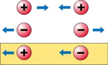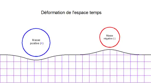 Cependant, l'expérience montre que les « charges graves » de même signe s'attirent, la loi universelle de la gravitation imposant alors symétriquement que des « charges graves » de signe contraire se repoussent. Contrairement au cas électrique, une matière composite formée de « charges graves » positives et négatives ne peut donc pas maintenir sa cohérence, et les charges de différents signes tendent à la fois à se regrouper entre elles, et à se placer le plus loin possible de corps de charge contraire. Une « charge grave » de signe opposé ne peut donc que fuir un centre de masse homogène comme la Terre, le Soleil, la Galaxie. Dans le champ gravitationnel terrestre, par exemple, une « charge grave » de signe opposé sera soumise à une accélération donnée par :
