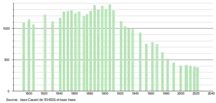 L'évolution du nombre d'habitants est connue à travers les recensements de la population effectués dans la commune depuis 1793. Pour les communes de moins de 10 000 habitants, une enquête de recensement portant sur toute la population est réalisée tous les cinq ans, les populations légales des années intermédiaires étant quant à elles estimées par interpolation ou extrapolation[27]. Pour la commune, le premier recensement exhaustif entrant dans le cadre du nouveau dispositif a été réalisé en 2007[28].