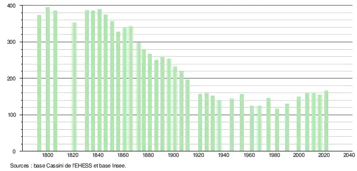L'évolution du nombre d'habitants est connue à travers les recensements de la population effectués dans la commune depuis 1793. Pour les communes de moins de 10 000 habitants, une enquête de recensement portant sur toute la population est réalisée tous les cinq ans, les populations légales des années intermédiaires étant quant à elles estimées par interpolation ou extrapolation[14]. Pour la commune, le premier recensement exhaustif entrant dans le cadre du nouveau dispositif a été réalisé en 2006[15].