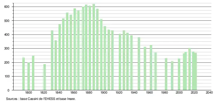 L'évolution du nombre d'habitants est connue à travers les recensements de la population effectués dans la commune depuis 1793. Pour les communes de moins de 10 000 habitants, une enquête de recensement portant sur toute la population est réalisée tous les cinq ans, les populations légales des années intermédiaires étant quant à elles estimées par interpolation ou extrapolation[24]. Pour la commune, le premier recensement exhaustif entrant dans le cadre du nouveau dispositif a été réalisé en 2008[25].