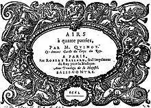 - Mathieu Quinot, Airs à 4 parties par M. Quinot, cy-devant Garde du Corps du Roy. - Paris, Robert III Ballard, 1662. 4 vol. 8° obl. RISM Q 110, Guillo 2003 n° 1662-L.